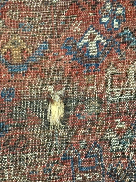 The second image shows the rug has an actual hole thru the warp and weft of the rug.