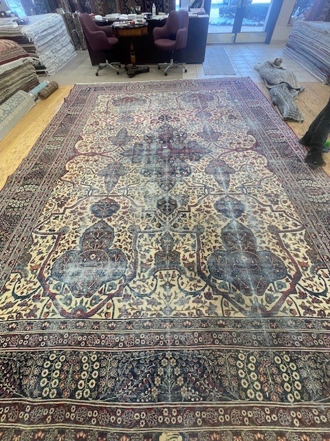This Yazd Kerman is an antique turn of the century Persian masterpiece rug. Jafri Oriental Rugs has serviced Dutchess County for over 45 years and is an authority on not only the history of the rug but the most proper way to repair it. The rug is incredibly valuable and is a palace size rug measuing 11'.6"x16'.2". The was produced in the town of Yazd, near Kerman, Iran. The first image shows the rug completely worn requiring the following work: