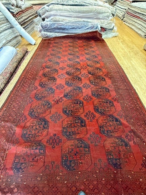 This Turkoman rug is an antique turn of the century tribal masterpiece. Jafri Oriental Rugs has serviced Ulster County for over 45 years and is an authority on not only the history of the rug but the most proper way to repair it. The first image shows the rug completely worn requiring the following work: