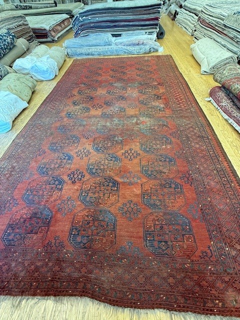 This Turkoman rug is an antique turn of the century tribal masterpiece. Jafri Oriental Rugs has serviced Ulster County for over 45 years and is an authority on not only the history of the rug but the most proper way to repair it. The first image shows the rug completely worn requiring the following work: