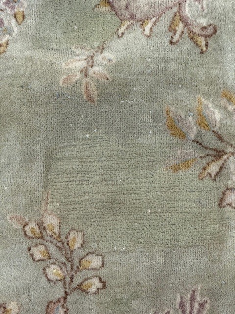 -Warp and weft coming thru the rug, and various holes throughout the field requiring reweaving and color restoration work where Jafri Rug restoration weavers match the wool dyes lots and reweave into the floral motifs of the rug.