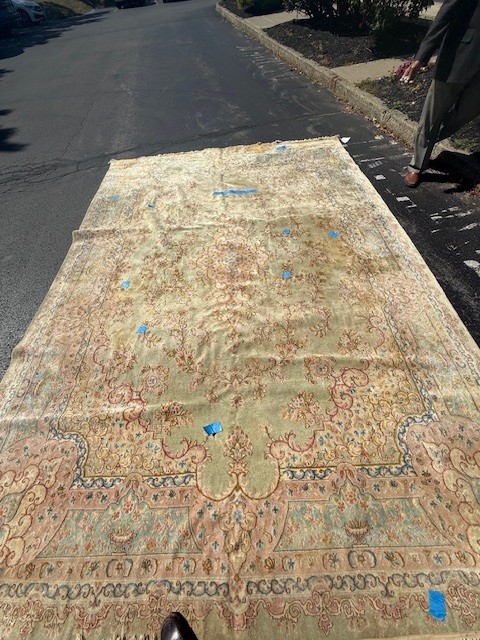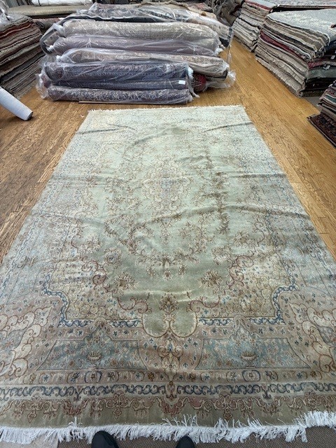 This Kerman is an antique Persian rug. Jafri Oriental Rugs has serviced Troy and Schenectady County for over 45 years and is an authority on not only the history of the rug but the most proper way to repair it. The rug is incredibly valuable and is 9x12. The first image shows the rug completely worn requiring the following work: