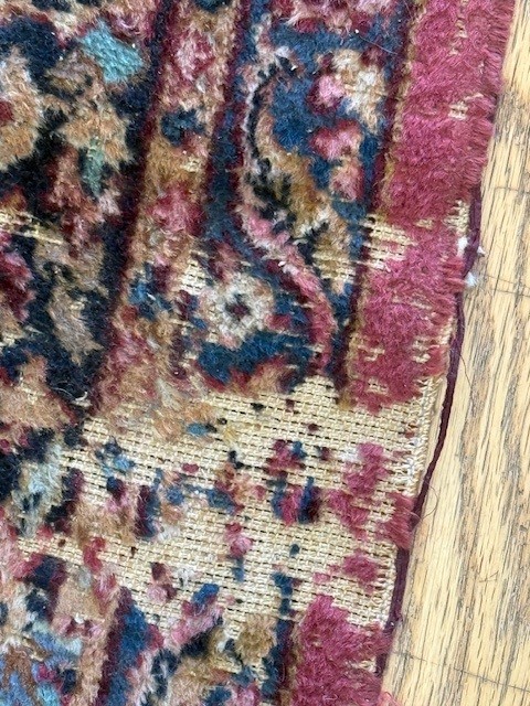 Fragile areas: worn patches, dry rot, loose fringe, holes, moth damage