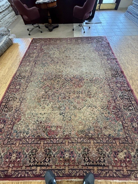 This is an example of a finely made Karastan rug that required enormous work. The wool that was used in this rug is New Zealand worsted wool. The rug is over 50 years old and is a valuable rug. Karastan came from the European markets and whilst the rug is machine made it still has value as it is an older Karastan from Belgium which has the classic Persian Sarouk design. The rug is worn and torn in several areas.