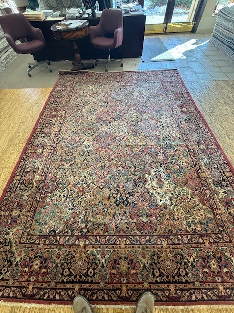 This is an example of a finely made Karastan rug that required enormous work. The wool that was used in this rug is New Zealand worsted wool. The rug is over 50 years old and is a valuable rug. Karastan came from the European markets and whilst the rug is machine made it still has value as it is an older Karastan from Belgium which has the classic Persian Sarouk design. The rug is worn and torn in several areas.