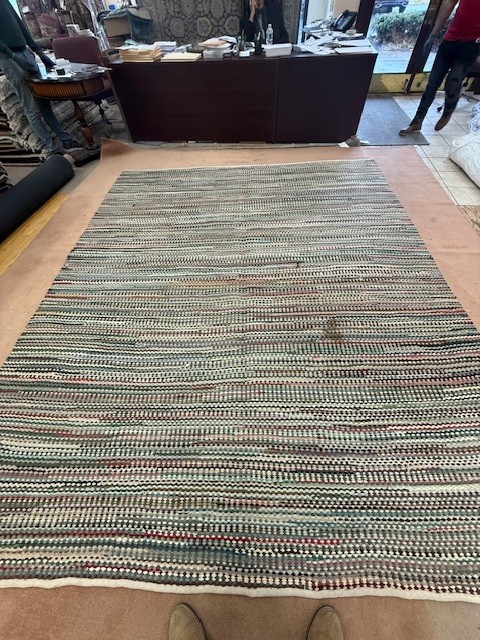 This is a finely braided rug. Rugs that are braided need to be cleaned and repaired in a very different way than other rugs with warp and weft. Due to the slits within the braids, when repairing a braided rug, one must be careful to not cause a gap in the weave of the rug.