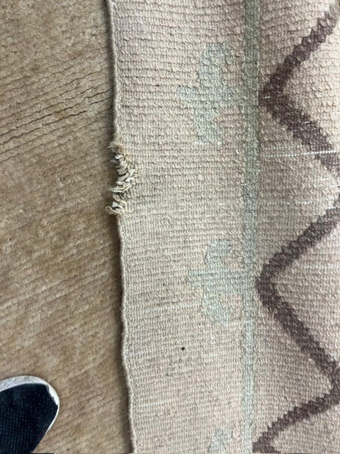 The first image shows how the rug is also torn off the binding which requires the rug to be rebound. The rug is also going to be cut down from its original size to a new size all of which is done in house.