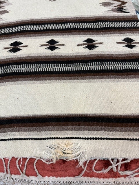 This is an example of a navajo kilim rug that had torn fringes. The kilim market is incredibly valuable due to its woven nature and the fact that these are tribal rugs that come from an actual Navajo tribe in the south west. The rug did have a few problems with it when inspecting it: