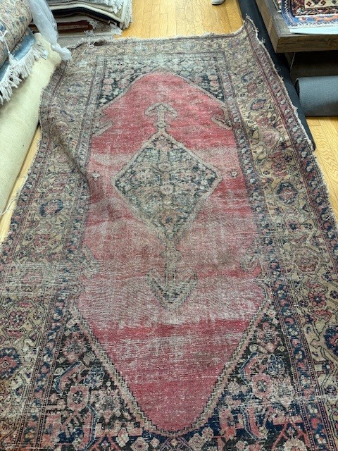 This is a classic Persian Heriz rug. The rug is completely worn and the warp and weft is showing heavily thru the pile of the rug.