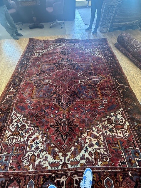 A Persian Heriz of this quality is a circa 1900 rug. The rug went thru water damage causing the rug to become brittle and course. The rug has to be organically washed and will require fringe and binding work to protect the warp and weft of the rug. The rug is having the following problems