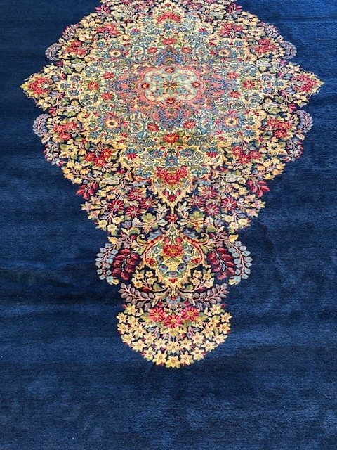 This is an example of a Persian Kerman that was water damaged. The rug had stains and required cleaning and color restoration.