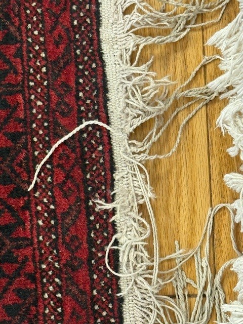 This is an example of Afghan Bashir rug that requires fringe repair that is done thru the following process: